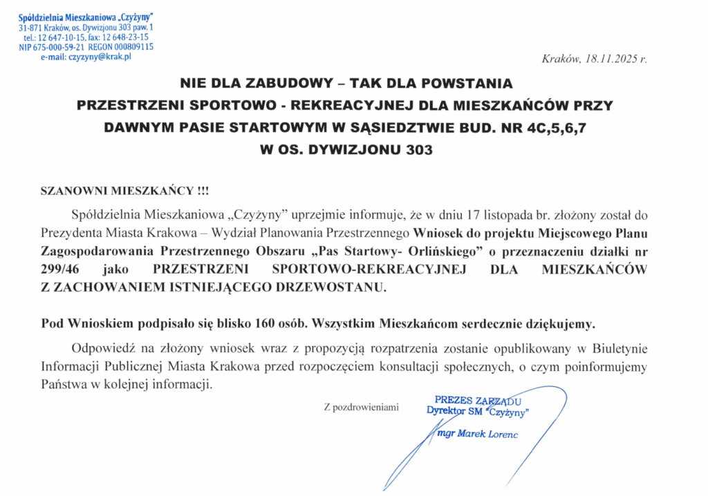 SPRAWA PILNA ! – tylko do 14 listopada br. można złożyć podpis pod Wnioskiem do projektu Miejscowego Planu Zagospodarowania Przestrzennego Obszaru „Pas Startowy- Orlińskiego” o przeznaczeniu działki nr 299/46 jako PRZESTRZENI SPORTOWO-REKREACYJNEJ DLA MIESZKAŃCÓW.