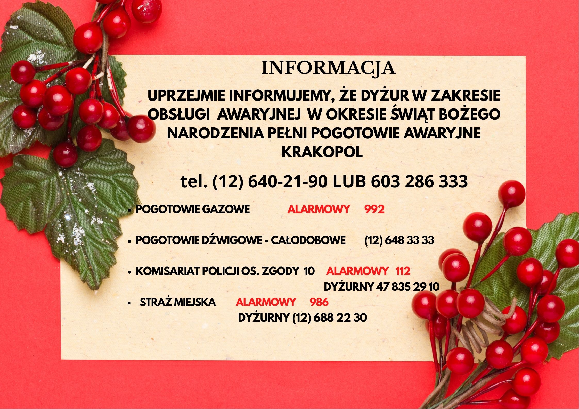Informacja o dyżurach pogotowia awaryjnego